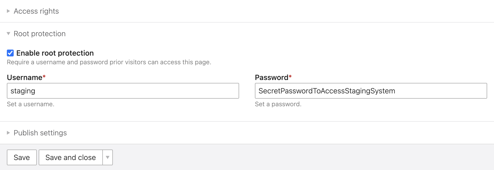 After the installation, go to the website root settings of your choice and select the "Enable root protection" checkbox. Then, provide the username and password, and save the record. That's it! From now on, your website will be accessible only after entering the correct credentials.